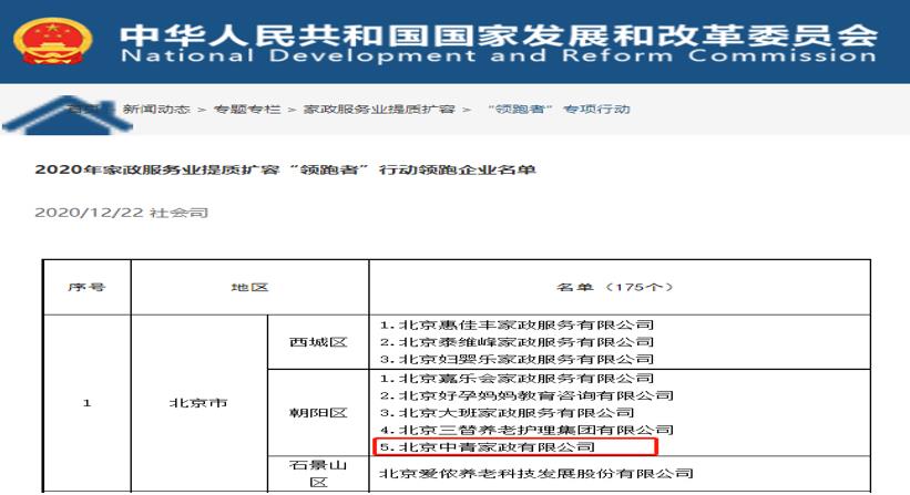 ●2020年国家发展改革委员会认定北京中青家政有限公司为“家政服务业提质扩容领跑者行动”领跑企业