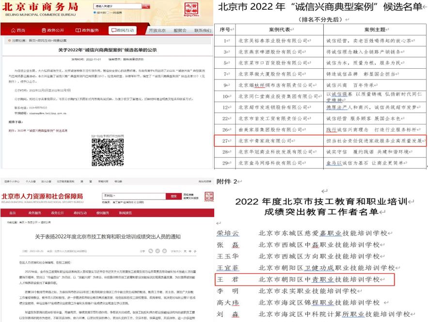 ●2022年中青家政纳入北京市“诚信兴商典型案例”候选单位,中青家政、中青职业技能培训学校董事长获评2022年度北京市技工教育和职业培训成绩突出教育工作者