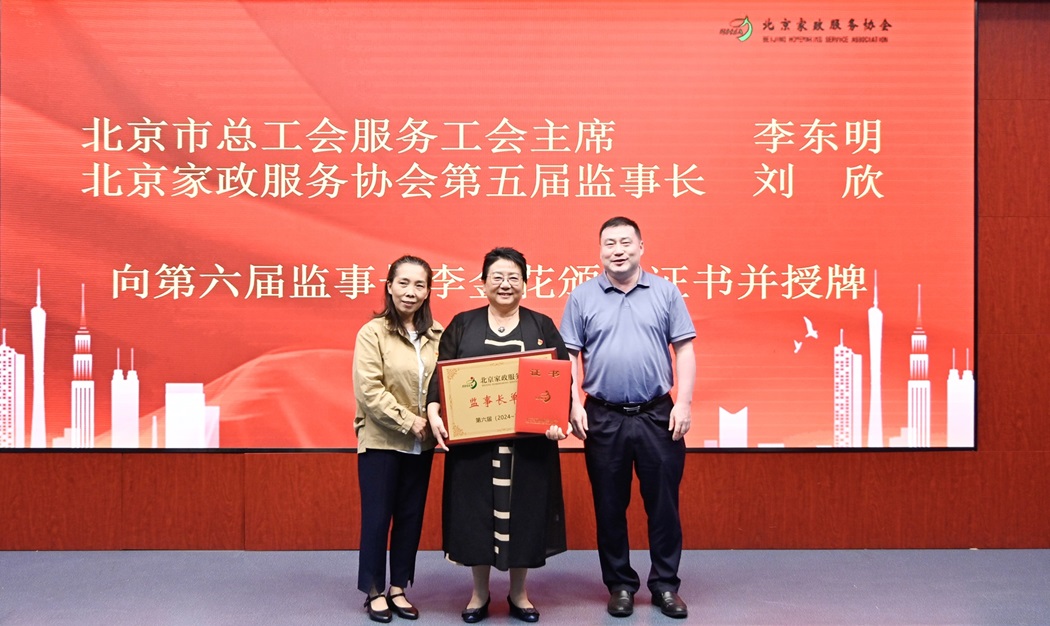 北京市总工会服务工会主席李东明、协会第五届监事长共同向协会第六届监事长李金花颁发监事长证书并授牌