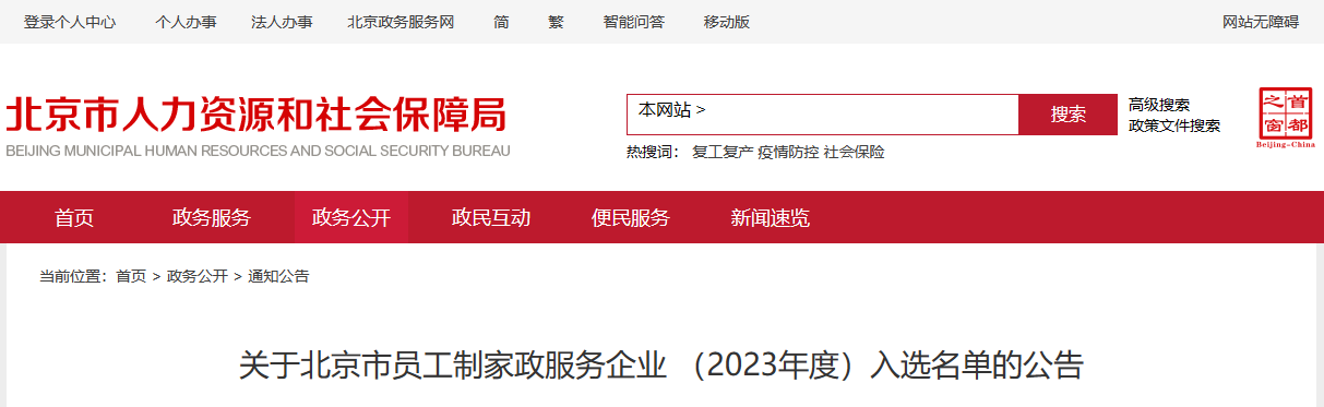 北京市人社局公示(2023年度)北京市员工制家政服务企业